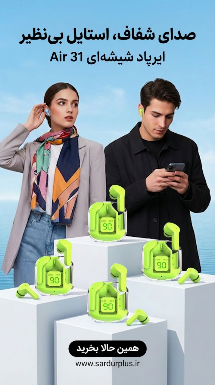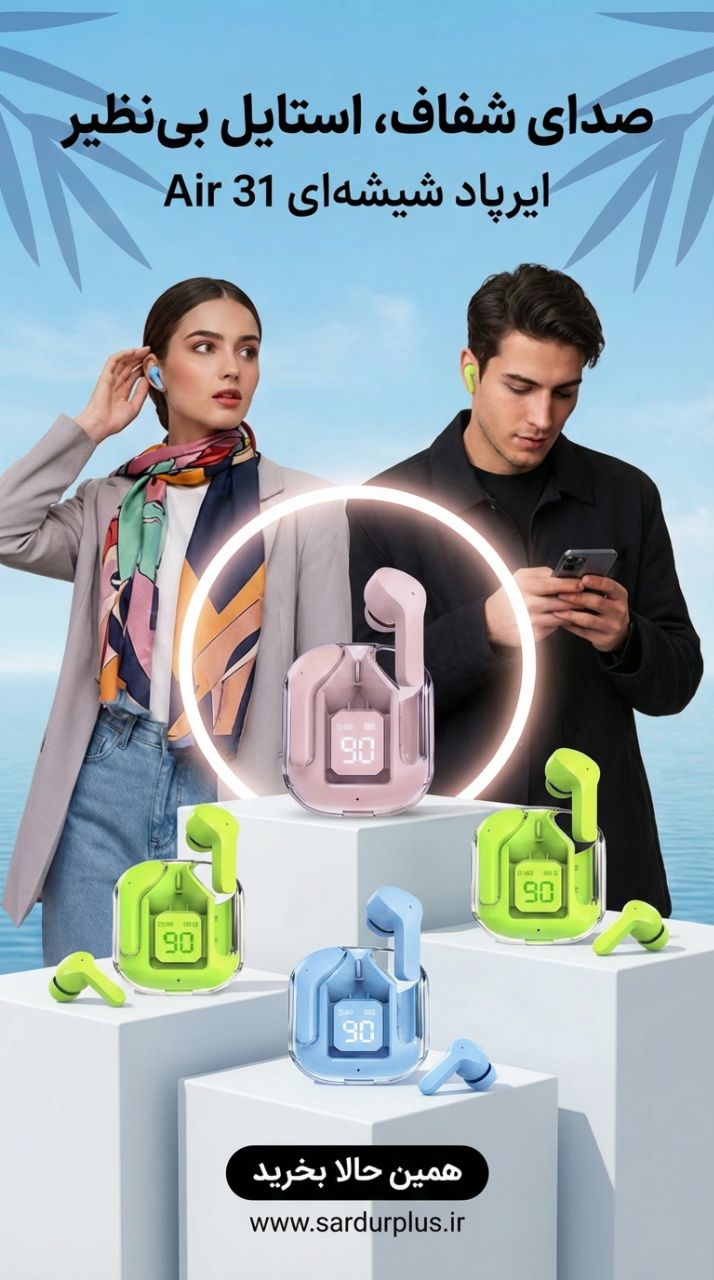 ایرپاد و هندزفری بلوتوثی مدل Air 31 طراحی شیشهای شفاف با نمایشگر دیجیتال